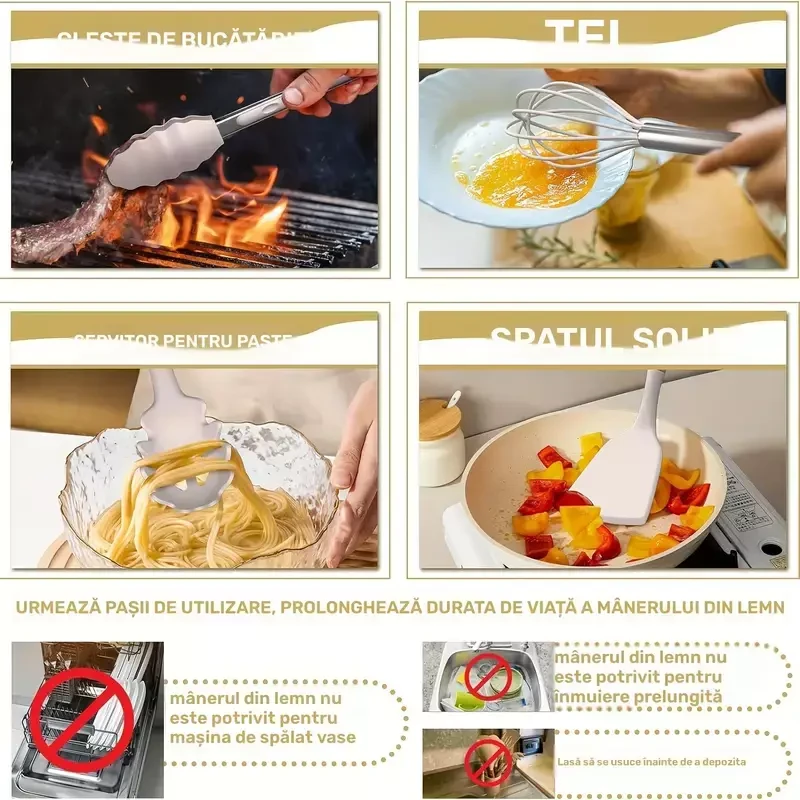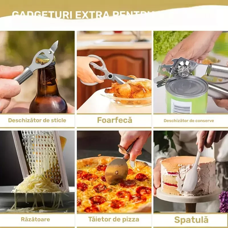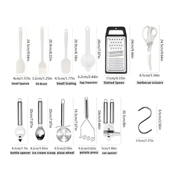 • Include: spatule, polonice, linguri, tel, pensulă, clești, linguri/cupe de măsurare, răzătoare, foarfecă, desfăcător, presă cartofi, cuțit pizza, suport, cârlige.