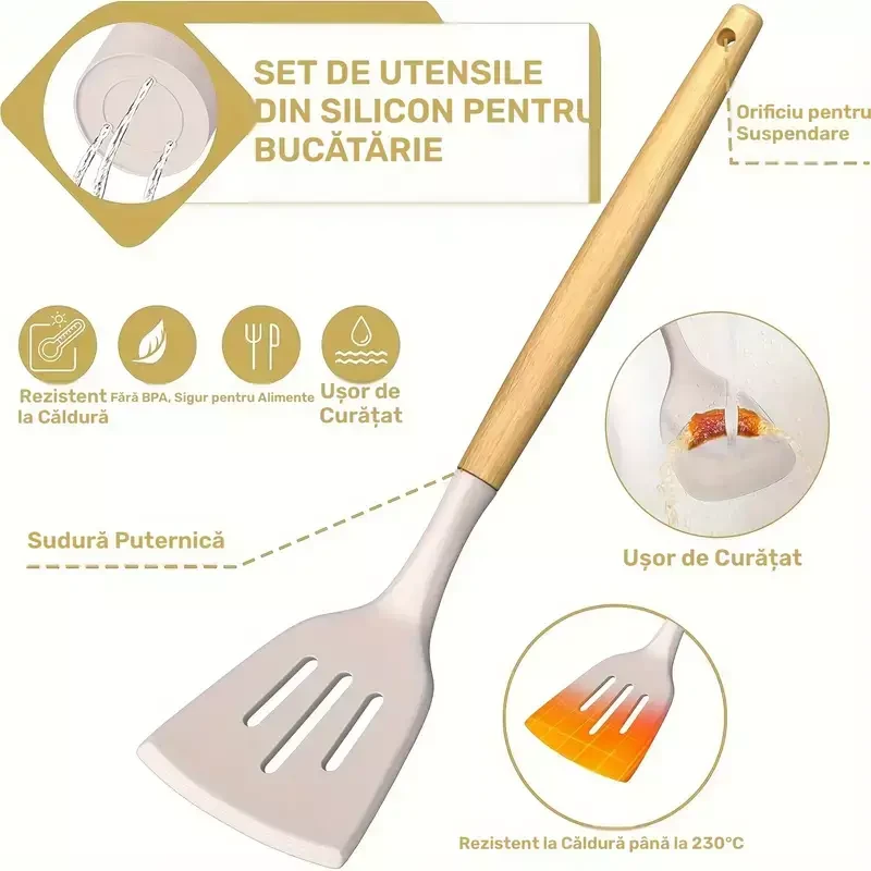 Acest set complet de 44 de piese din silicon alimentar este soluția ideală pentru orice bucătărie modernă. Include toate accesoriile necesare pentru gătit: spatule, polonice, tel, perii, clești, linguri și căni de măsurare, răzătoare, foarfecă, desfăcător, cuțit pentru pizza și suport de depozitare. Fabricate din silicon rezistent la temperaturi înalte, ustensilele sunt sigure pentru vase antiaderente, practice și ușor de curățat.