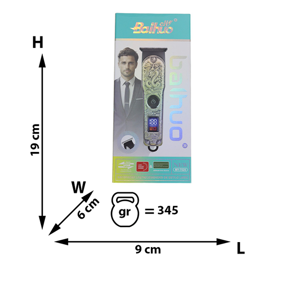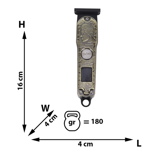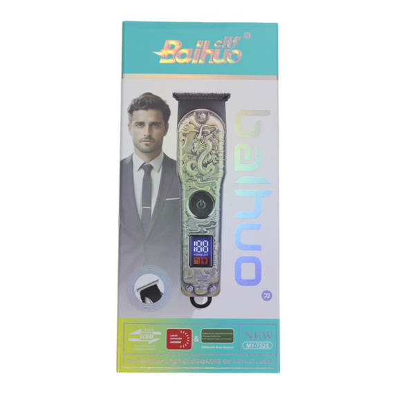 Trimmer 60 MY7525, design modern, carcasă metalică rezistentă cu gravuri decorative, cum ar fi modele de dragon. Utilizare: Este un dispozitiv reîncărcabil, potrivit pentru tunsul părului, bărbii și conturarea precisă.